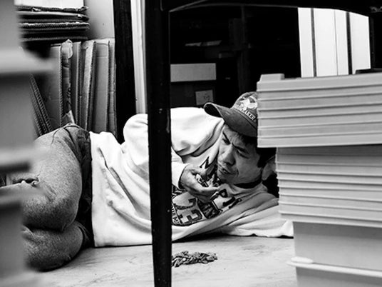 岡元氏の力強い墨のドローイングは、床に寝転び音楽を聴きながら描かれる、重なり合う線の集積から生まれたものです。一つひとつの線が繰り返しと動きを通じて形を生み、作品全体に独特のリズムと躍動を与えています。人物や風景、雑誌、画集などをモチーフに、墨汁と割り箸を用いて制作。全体像を素早く捉えて描いた後、線の上を何度も塗り重ねることで、飛び散る墨の滴や擦れた線が、豊かな表情とエネルギーを作品に加えています。