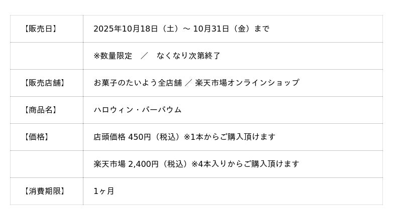 株式会社太陽社(所在地:千葉県匝瑳市飯倉293、代表取締役:片岡正裕)が展開する千葉県で長年愛される菓子店「お菓子のたいよう」は、10月18日(土)よりハロウィン限定スイーツ第1弾「ハロウィン・バーバウム」を発売いたします。千葉県産の米粉を100%使用したしっとり・もっちり食感のバウムクーヘンをアイスキャンディのようなスティックスタイルに仕上げ、チョコレートとオバケでデコレーションしたハロウィン限定仕様。さらに今年は、初のオンライン注文にも対応。限定ギフトボックス入りで、全国どこからでもお楽しみいただけます。