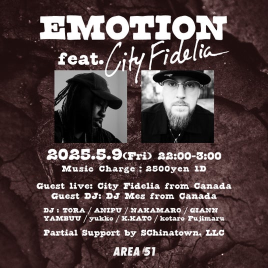2025年5月9日(金) 22:00-3:00「EMOTION feat. City Fidelia 」AREA51 / 17MAP MINAMI 〒542-0085 大阪府大阪市中央区心斎橋筋2丁目3-7ROYAL KITAGAWA