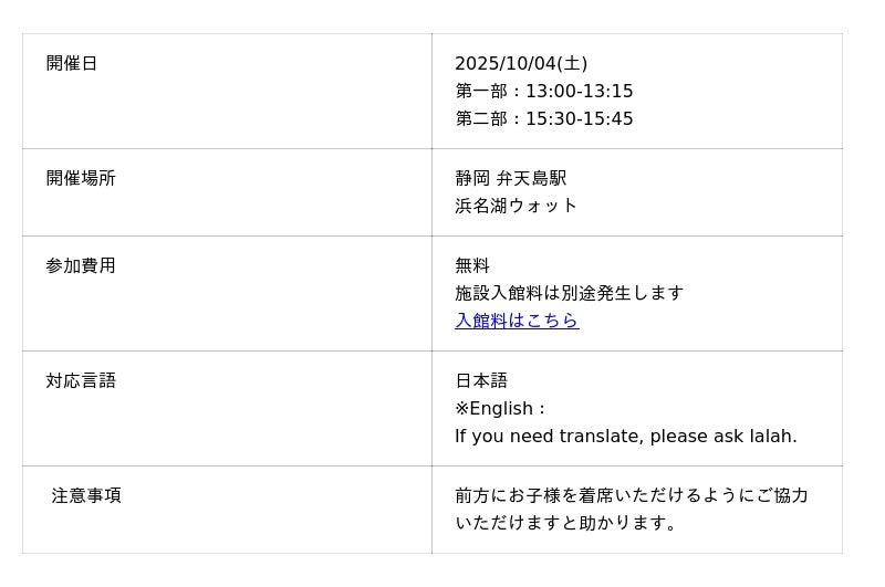日程:10月04日(土)場所:浜名湖体験学習施設ウォット(静岡県浜松市西区舞阪町弁天島5005-3)