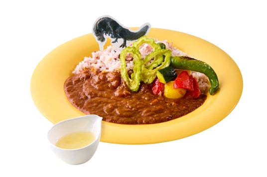 イビルジョーの雑穀米カレー レモンソース添えみんなのトラウマ、何でも喰らう雑食のイビルジョーを雑穀米カレーで表現。屈強な体を伏見唐辛子で、特徴的な口をゴーヤチップスで再現しました。お好みで滴る酸性のよだれ(レモンソース)をかけてお召し上がりください。