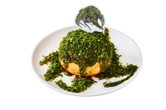 ゴア・マガラ&シャガルマガラのファルファッレパスタゴア・マガラとシャガルマガラ、2体のモンスターを1皿で楽しめる1品。ゴア・マガラの鱗粉を紫のりで、シャガルマガラの翼をファルファッレで表現しました。紫のりとカルボナーラソースは相性抜群です。