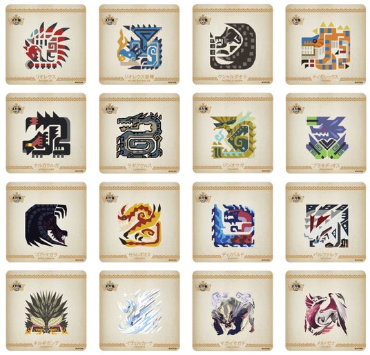 メインモンスターアイコンカプチーノにもなったモンスター大狩猟展ARに登場する16体のメインモンスターのアイコンのカフェラボ限定オリジナルコースターをコラボメニュー1品ご注文につき、ランダムで1枚差し上げます。