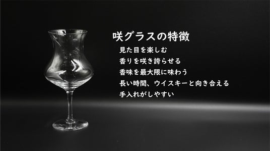咲くには開花するという意味があり、ウイスキーの「香りを咲き誇らせる」ようなグラスにしたいという想いにぴったりな意味合いと考えて名付けられました。また、「咲」と書いて「えみ」と読むことが知られております。「咲(SAKI)グラス」を使って「笑み」が満開になっていただければという想いも込められています。