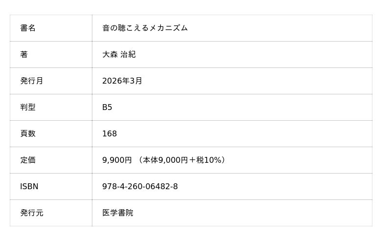 株式会社医学書院 (所在地:東京都文京区 代表取締役社長:金原 俊)は、書籍『音の聴こえるメカニズム』(著 大森治紀)を2026年3月16日に刊行しました。生き物は音を、どう“聴いている”のか。聴覚生理学の精緻な仕組みに迫る一冊です。