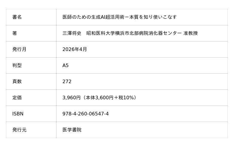 株式会社医学書院 (所在地:東京都文京区 代表取締役社長:金原 俊)は、書籍『医師のための生成AI超活用術-本質を知り使いこなす』(著:三澤 将史)を2026年4月6日に発売しました。