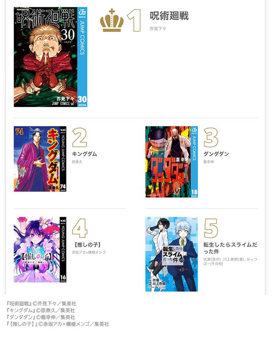 第3位の『ダンダダン』は、メディア化の影響が非常に大きかった作品で、2024年秋から冬にかけてのTVアニメ放送にあわせて売り上げが急上昇。2024年12月に最終巻がリリースされた『【推しの子】』も、TVアニメ放送からさらに人気を伸ばし、最終的に第4位となりました。