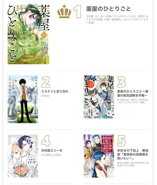 1位:『薬屋のひとりごと』 日向夏(ヒーロー文庫/イマジカインフォス)(原作), ねこクラゲ(作画), 七緒一綺(構成), しのとうこ(キャラクター原案)