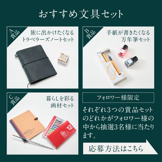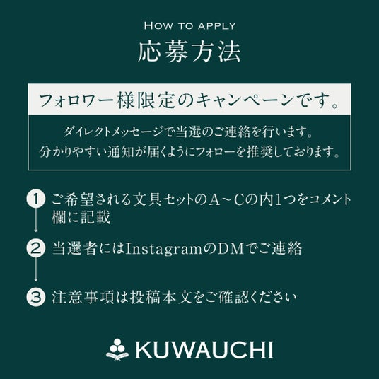 @kuwauchi_stationery( https://www.instagram.com/kuwauchi_stationery/ )をフォローされている方は希望する商品番号A~Cをコメント欄に記載してください。