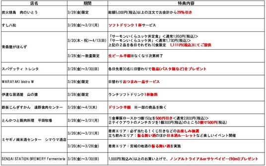 各店の特典サービス一覧