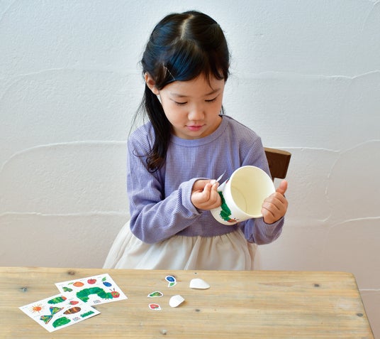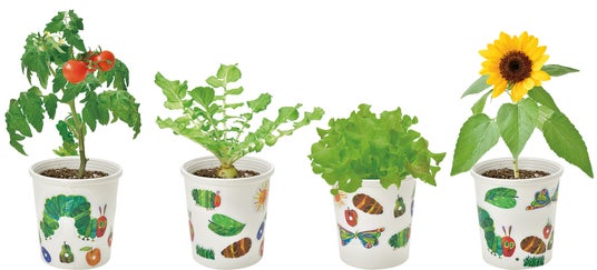 はらぺこあおむしのシールを自由にペタペタ貼ってオリジナルポットを作る栽培セットです