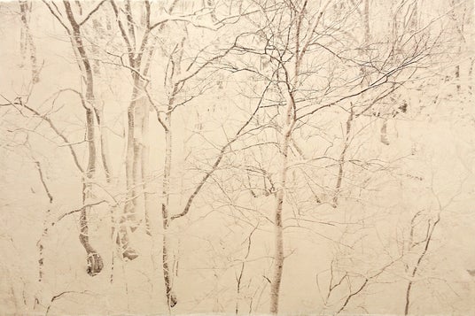 雪景色の余白をいかした風景を和紙の上に表現した幻想的な世界が広がるシーズン・ラオの代表作から新作まで11点を展示。