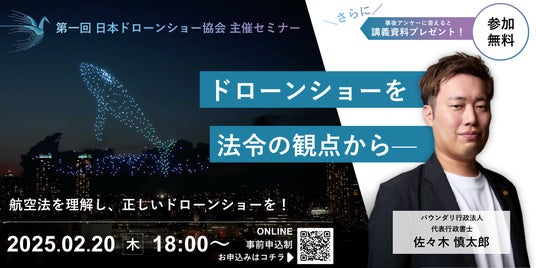 一般社団法人 日本ドローンショー協会(所在地:東京都港区、代表理事:佐々木 孔明、以下「日本ドローンショー協会」)は、ドローンショーの認知拡大と品質向上を目的に、ドローンショーと法令に特化した無料ウェビナーを2025年2月20日(木)に開催いたします。