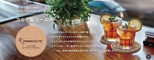 パラシュート株式会社は、自然素材であり厚みのあるコルクにも精巧に刻印できるデジタルレーザー加工技術に注目し、商品をコルク製コースター1品に絞った特設サイトを開設しました。これによりユーザーは基本8種類のテンプレートの中からデザインを選択し、簡単にブランド名などが入ったコルク製コースターを発注できるようになりました。1枚1枚デザインが違うものを印刷でき、高級感があり温かみのあるコルク製コースターにオリジナルデザインが刻印されることにより、ドリンクを提供する際の飲食店のブランディングに寄与します。