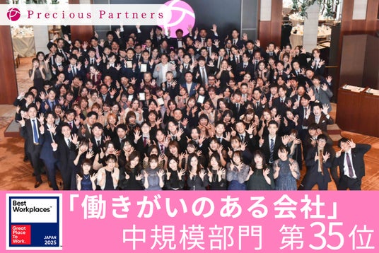 採用コンサルティング事業を行う株式会社プレシャスパートナーズ(本社:東京都新宿区、代表取締役社長CEO:高崎 誠司、以下:プレシャスパートナーズ)は、Great Place to Work(R) Institute Japan(以下、GPTW)が主催する2025年版「働きがいのある会社」ランキングベスト100に選出され、中規模部門で第35位となりました。今回で8年連続の選出となります。