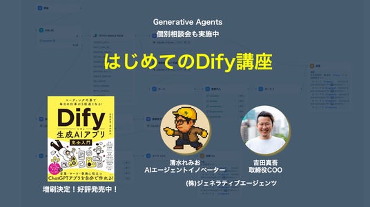 株式会社ジェネラティブエージェンツ(本社:東京都港区、代表取締役CEO:西見公宏)の吉田・清水が、ノーコードで生成AIアプリを開発できるプラットフォーム「Dify」に焦点を当て、Difyアプリケーション開発のノウハウを盛り込んで執筆した新刊書籍『コーディング不要で毎日の仕事が5倍速くなる!Difyで作る生成AIアプリ完全入門』が株式会社日経BP(所在地:東京都港区)から発売されました。