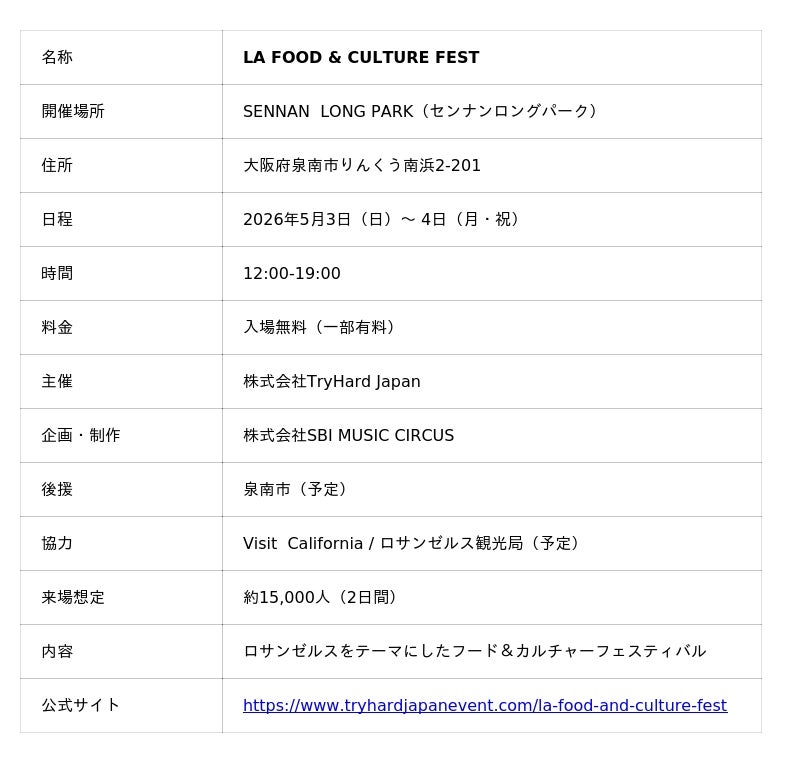 株式会社SBI MUSIC CIRCUS(本社:東京都港区、代表取締役社長:大付 楽洋、以下「当社」)は、2026年5月3日(日)~4日(月・祝)のゴールデンウィーク期間に大阪・泉南市のSENNAN LONG PARK(センナンロングパーク) にて開催される、ロサンゼルスの食・スポーツ・カルチャーを体感できるイベント 「LA FOOD & CULTURE FEST」 に企画制作協力として参画することをお知らせいたします。