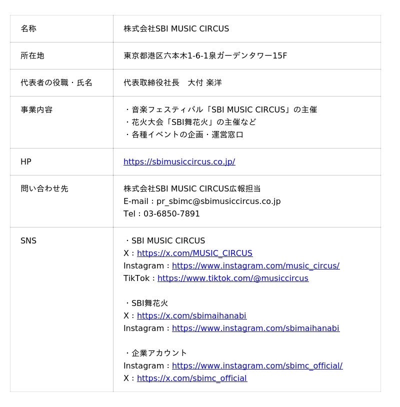 株式会社SBI MUSIC CIRCUSは、「エンタテインメントの力で、世界一笑顔を届ける」をミッションに掲げ、国内最大級の音楽フェスティバル「SBI MUSIC CIRCUS」や、関西最大級の花火大会「SBI舞花火」などを手掛けています。