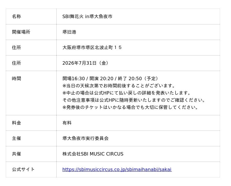 株式会社SBI MUSIC CIRCUS(本社:東京都港区、代表取締役社長:大付 楽洋、以下「当社」)は、2026年7月31日(金)、堺市大浜公園にて開催される「堺大魚夜市(さかいおおうおよいち)」とのコラボレーション企画として、「SBI舞花火 in堺大魚夜市」の開催をお知らせいたします。