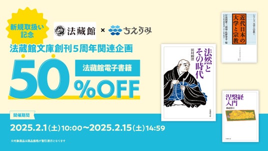 株式会社佼成出版社(本社:東京都杉並区、代表取締役:中沢純一)が運営する、電子書店「ちえうみ」では、株式会社法藏館(本社:京都市下京区、代表取締役:西村明高)の電子書籍の取扱いを記念し、【法藏館電子書籍50%OFFフェア】を2025年2月1日(土)より開催します。対象商品は法蔵館文庫を含む70冊です。