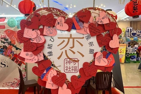 日本文化体験「恋の神社」展示コーナー。来場者がハート型の絵馬に願いを込めて掲げた