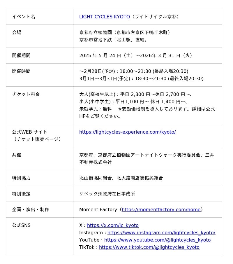 時間:「LIGHT CYCLES KYOTO」の開催時間に準じて実施