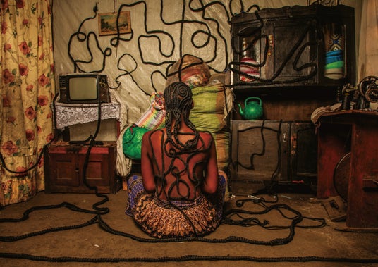 「衣装は、色や形、テクスチャーを通じて物語をより鮮明に伝えます。明るい色が作品に希望と命を吹き込んでくれるので、私の作品作りには欠かせません」と語るトゥリゾは、衣装を自らデザインすることで作品に込めたメッセージを強調。劣悪な生活環境とは対照的な素晴らしい衣装で、女性たちの美しさに敬意を表します。奴隷女性たちが搾取の場から逃れる道を示す地図として利用した編み込まれた髪型は希望の象徴です。