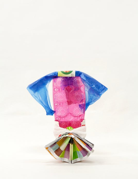 2015年6月26日「お内裏様かお雛様」卵のプラスチックパック、いちご牛乳の容器、野菜チップの袋、青いビニール袋、ティーバッグ、ティーバッグの袋
