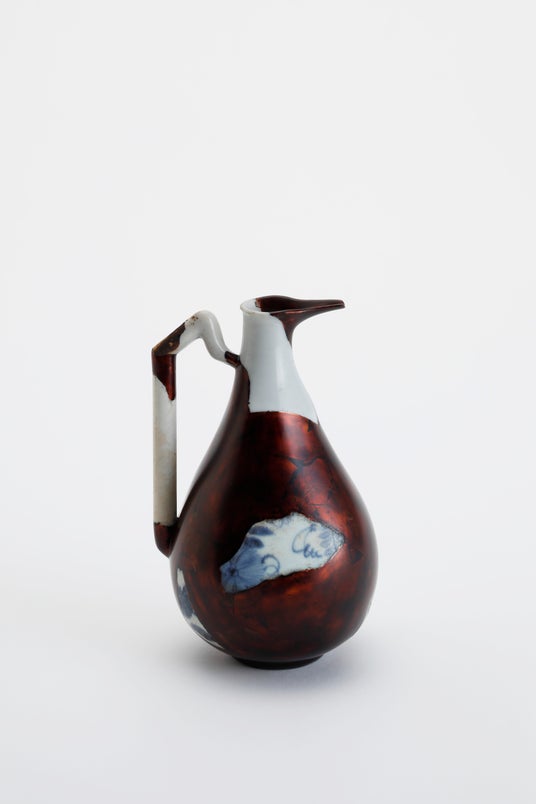 「高瀬川水瓶」、漆、高瀬川の磁器片、銀、錫、麻布、砥の粉、和紙、木、フェルト、110×100×180mm、2024年 撮影:来田猛