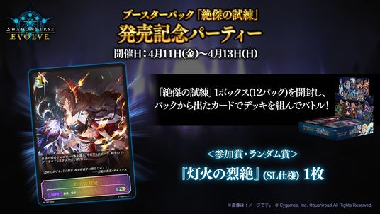 株式会社ブシロード(本社:東京都中野区、代表取締役社長:木谷 高明)と株式会社Cygames(本社:東京都渋谷区、代表取締役社長:渡邊 耕一)は、4月11日(金)に、『Shadowverse EVOLVE』より、ブースターパック「絶傑の試練」を発売することをお知らせいたします。報道関係の皆様におかれましては、ぜひ誌面やWeb媒体で本情報をお取り上げいただけますようお願い申し上げます。