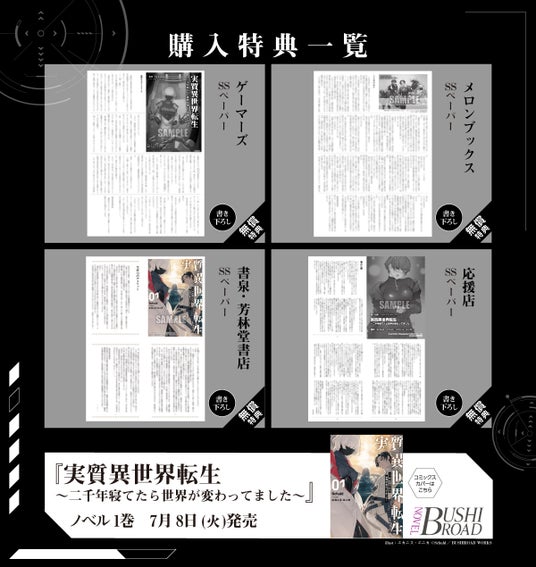 株式会社ブシロード(本社:東京都中野区、代表取締役社長:木谷高明)のグループ会社にあたる株式会社ブシロードワークス(本社:東京都中野区、代表取締役社長:新福恭平)は、本日7月8日(火)に「ブシロードノベル」より『実質異世界転生 ~二千年寝てたら世界が変わってました~』第一巻が発売することをご案内致します。また、6月7日(土)に「ブシロードノベル」創刊1周年を迎えたことを記念しまして、電子書籍フェアも実施中です。