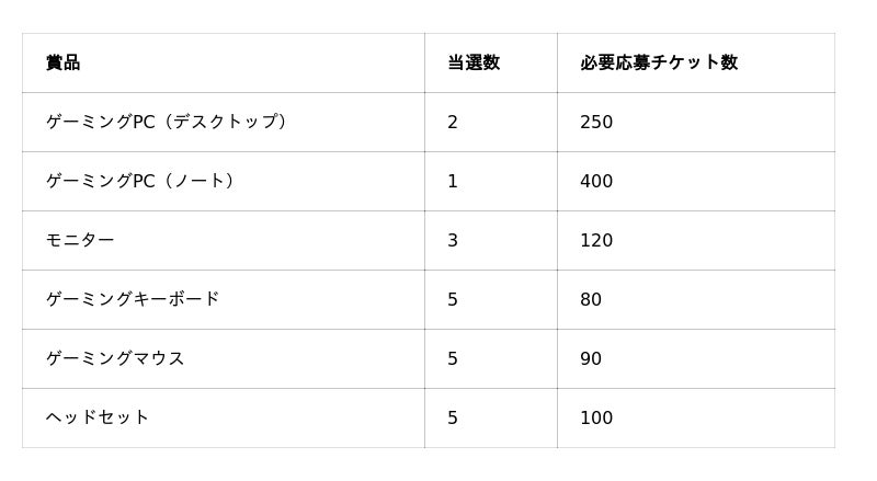 チャレンジャーズワールドミッションをクリアして集めた応募チケットで、お好みの賞品に応募しましょう。ゲーミングPCや周辺機器加えて、NEXONポイントや本キャンペーンのオリジナルグッズなどの豪華賞品を、抽選でプレゼントいたします。<応募期間> 2025年7月30日(水) ~ 10月7日(火)23:59