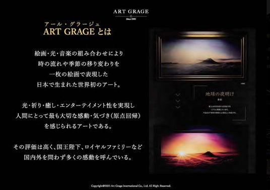 アール・グラージュとは、絵画・光・音楽の組み合わせにより時の流れや季節の移り変わりを一枚の絵画で表現した日本で生まれた世界初のアート。光・祈り・癒し・エンターテイメント性を重視し、人間にとって最も大切な感動・気づき(原点回帰)を感じられるアートである。その評価は高く、国王陛下、ロイヤルファミリーなど、国内外を問わず多くの感動を呼んでいる。~アール・グラージュ公式HPより抜粋~