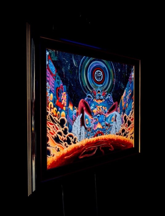アール・グラージュの作品の前に立つと、その圧倒的な存在感によって絵画の世界に引き込まれ、没入感覚を味わう。1995年にこの技法が発表されて以来、これまでアールヌーボーの巨匠アルフォンス・ミュシャ、江戸時代の浮世絵師・葛飾北斎など、著名な作品の数々がアール・グラージュとのコラボレーションによって新たな価値を見出されてきた。そして今回の大阪・関西万博『世界のMUSASHI個展』ではこのアール・グラージュとMUSASHIアートのコラボレーションブースが600平方メートル の会場の一角に設置された。壁に囲まれた部屋の中には2つの作品が展示され、大胆な構図や多色使いが印象的なMUSASHIアートが、光と音とを掛け合わせたアール・グラージュの技法によって総合芸術としてさらに輝きを増し、唯一無二の世界観を創り出した。