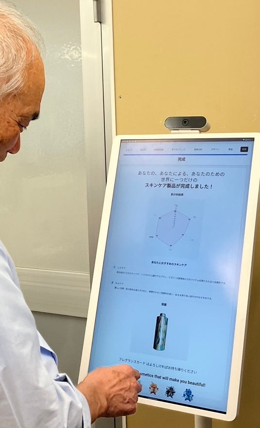 プリマール株式会社がめざしているのは、すべての工程をオーダーメイドで行うスキンケア化粧品。未だ商品化には至っていないものの、近い将来に実現する「未来のオーダーメイド化粧品」の製作システムをパートナー企業5社で開発中だ。万博の出展会場では、原料となる細胞の培養過程、その日の感情をもとにした香りを提案するAI診断、3Dプリンターでの容器作成までを疑似体験できるアプリ “スキンシェフ” を展示する。アプリ内で質問に沿って答えていくと、自分の肌質や好みにぴったりの化粧品が出来上がるという、まさに未来の化粧品をイメージさせる仕掛けが用意されている(万博会場で実際に持ち帰れるのはオリジナルフレグランスカードのみ)。