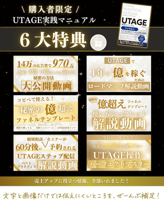 本書には購入者限定のシークレット6大特典がついており、文字と画像のみの書籍ではどうしても伝えにくかったところや文字数の関係で泣く泣く削った内容を完全網羅しております。UTAGEを活用してビジネスを成長させたい方はぜひご購入ください。
