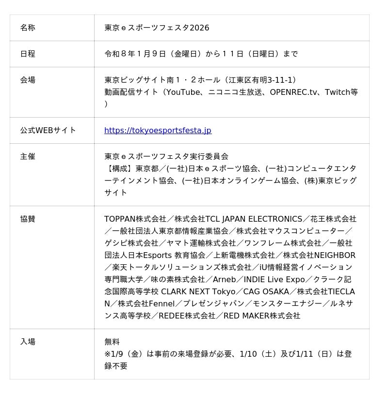 東京eスポーツフェスタ実行委員会は、eスポーツの普及と関連産業の振興を目的として、eスポーツの競技大会と関連産業展示会等で構成するイベント「東京eスポーツフェスタ2026」(以下「フェスタ」という。)を令和8年1月9日(金)~1月11日(日)の3日間にわたり開催しました。