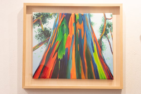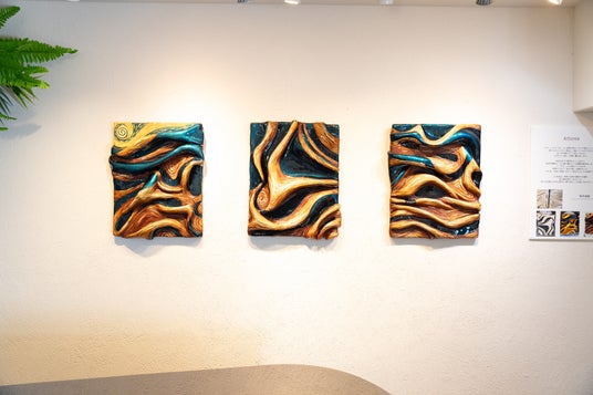 彼女の作品はレジン、木材、顔料などの多層的な素材を用いて、美しい自然を幻想的に表現している。