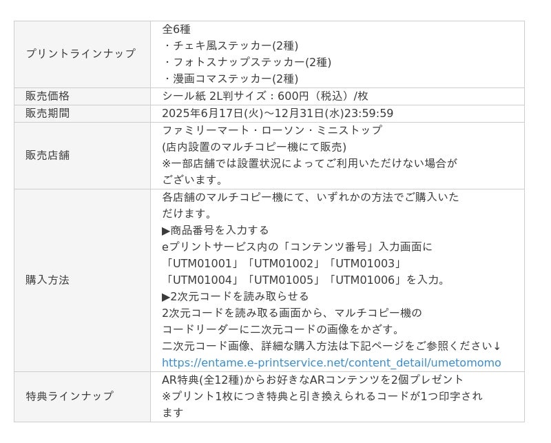 ストーリアダッシュ(竹書房)連載中『うめともものふつうの暮らし』の10巻発売を記念して、全国の各コンビニエンスストアのマルチコピー機にてプリント全6種をステッカー形式で販売。