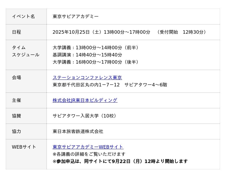 各講義の詳細は、「東京サピアアカデミーWEBサイト」(9月11日オープン)からご覧いただけます。なお、参加申込は9月22日(月)12時より同サイトにて受付を開始します。