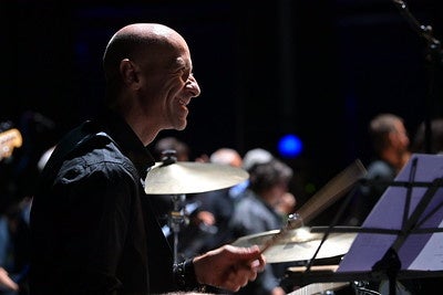 中央:両手を広げて指揮をする音楽家の蓮沼執太。空き瓶、タップダンス、ジャンベ、カリンバなど、従来の『喜びの歌(第九)』には登場しない楽器の演奏者たちの音もアンサンブルとしてまとめ上げていく。