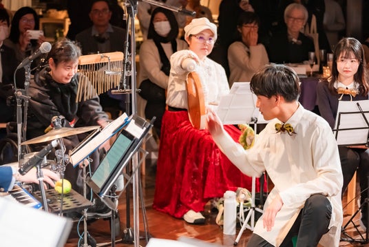 ワールドプレミアの様子:蓮沼の合図に応じて、ウインドチャイムを奏でる脳性麻痺のプレイヤー。