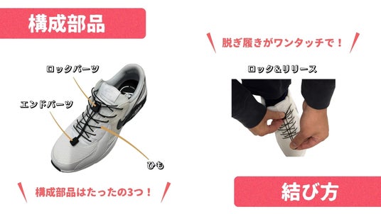「ほどけない靴紐」とは、3つの構成パーツ(ロックパーツ・エンドパーツ・ひも)からなる靴紐のことです。外に出る時、座敷に上がる時、靴紐がほどけた時など、面倒な靴紐結びを、ワンタッチで手軽なものにしてくれます。また歩いているときや、走っているときに、途中でほどけることなく、安全で快適な足元を演出してくれる商品です。