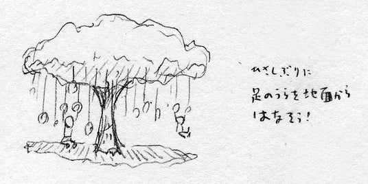 本展のみどころのひとつは、会場内に登場する大きな「森」です。中では、つり輪につかまって、「おとなでいるのにつかれたら あしのうらをじめんからはなせばいい」(『あつかったら ぬげばいい』(白泉社)より)という一節を体験できたり、誰にも見せない絵を描いて、自分だけの秘密にしたまま、シュレッダーで粉々にしてみたり、絵本からさらに一歩踏み込んでヨシタケさんが大切にしている考え方に触れることができます。