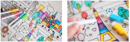 テーブルなどどこでも広げられるシリコンマットに、世界各地の名所が描かれており自由に塗り絵ができる商品。書いて消せる8色ペンを使ってレインボーカラーで好きなように彩りながら、繰り返し遊ぶことができます。さらに、マットに描かれている世界の名所を親子で一緒に楽しむことができる「遊びながら学べる!ガイドシート」も付属。