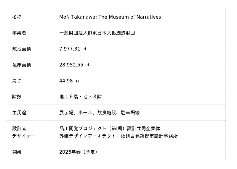 一般財団法人JR東日本文化創造財団は、TAKANAWA GATEWAY CITY(JR東日本・高輪ゲートウェイ駅)に、伝統を未来へつなぎ、新たな日本文化を創造・発信するミュージアム「MoN Takanawa: The Museum of Narratives(モン タカナワ:ザ ミュージアム オブ ナラティブズ)」を、2026年春開館します。