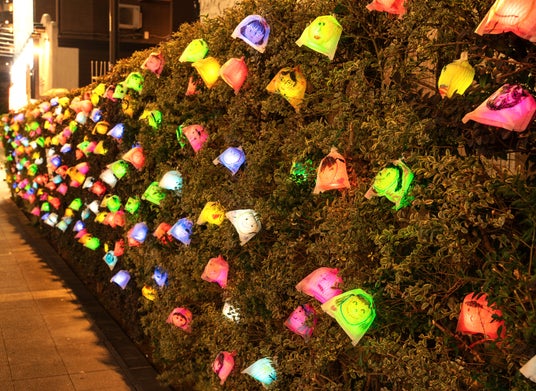 美術家の高橋匡太さんが考えた、みんなで作るイルミネーション作品。果実袋にあなたの大好きな人の「えがお」を描き、LEDの光を入れて樹木に取り付けます。みんなの「えがお」が、たくさんの「ひかりの実」となって灯り、あたたかな夜の風景をつくります。京急蒲田あすと東側入口にて。