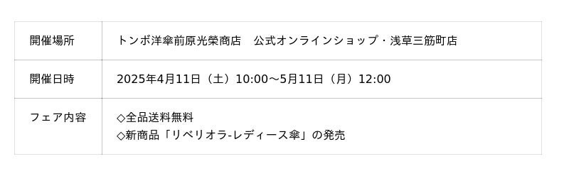 老舗洋傘メーカー・前原光榮商店では、2026年5月10日(日)の母の日に向け、『全品送料無料』の”母の日フェア”を開催いたします。雨傘・日傘、メンズ・レディース問わずすべての傘を無料でお届けいたします。この機会に是非トンボ洋傘前原光榮商店をご利用くださいませ。