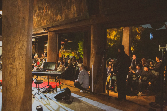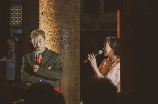 On Friday, October 31, the eve of the exhibition, a reception party was held for invited guests.Following a private preview of the exhibition, the evening featured a live performance and talk session by Akie Abe and Hiroto Rakusho on the famed Kiyomizu Stage, creating a memorable prelude to the exhibition’s opening.