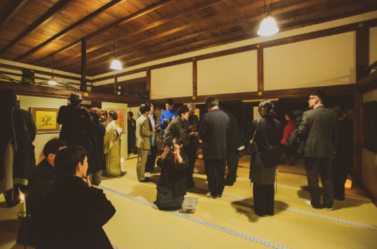 展覧会開幕前日の10月31日(金)には、関係者をお招きしたレセプションパーティーを実施いたしました。展示内覧ののち、清水の舞台にて安倍昭恵氏と裕人礫翔氏によるライブパフォーマンスやトークショーも行われ、大いに盛り上がりました。